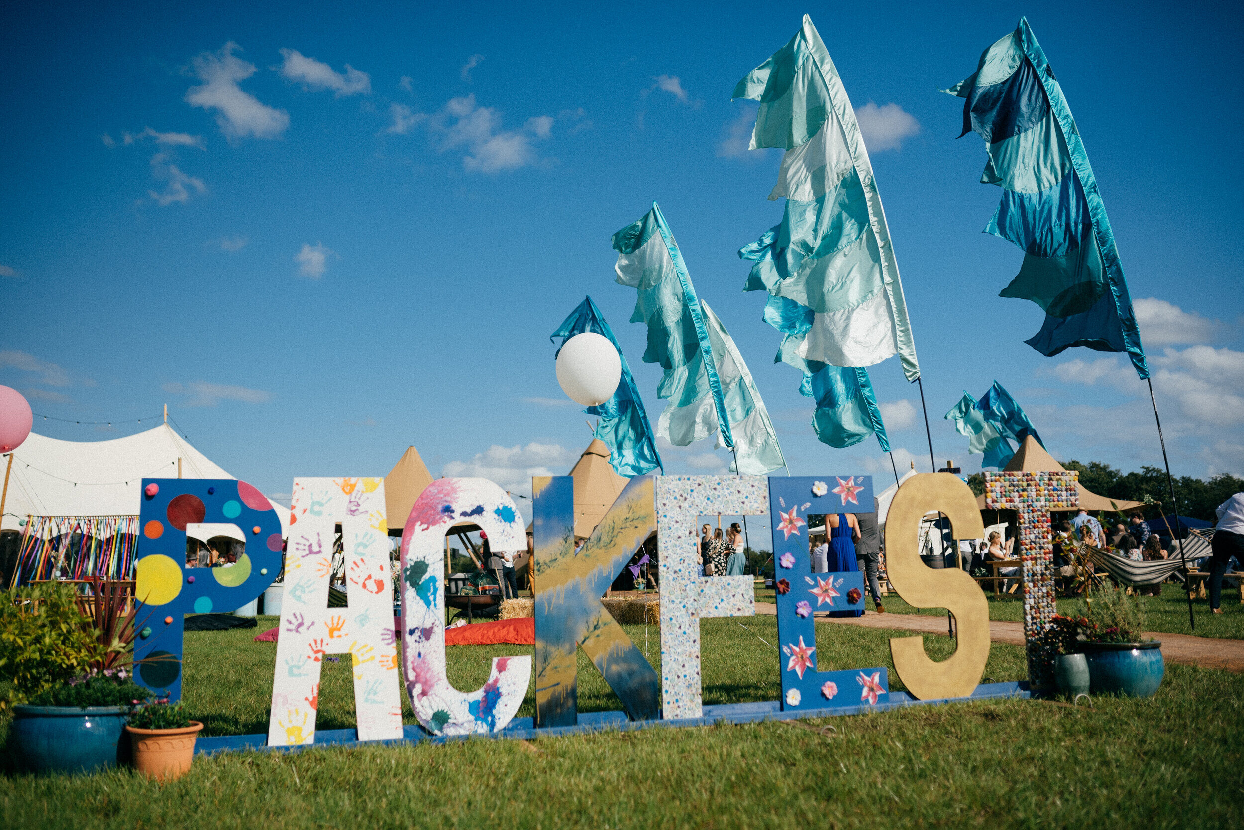 The ceremony was conducted by our truly wonderful friend; Suzanne Uprichard, who had the crowd both laughing and crying as she regaled tales of our relationship in the miraculous, glorious sunshine. After the short ceremony PACKFEST was announced open and guests were set free to dance along to one of the 7 acts on the main stage, choose food from the street food vendors at their leisure, learn circus skills, decorate themselves in glitter and wet their whistles at the beer stall and cocktail bar. Adam’s cousin, Jo, made an amazing watercolour and gold leaf cake, which was accompanied by brownies, cupcakes and a sweet stand. All of the fun, love and excitement of a truly unforgettable day was captured by the amazing photographers and videographers.